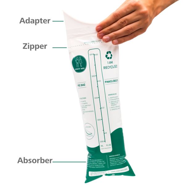 Superabsorber im Inneren des Beutels wandeln den Urin innerhalb von Sekunden in Gel um. Gerüche und Bakterien werden dadurch gebunden. Der Zipper-Verschluss macht den Beutel auslaufsicher. Jeder Beutel hat ein Volumen von 600 ml und kann mehrfach genutzt werden.